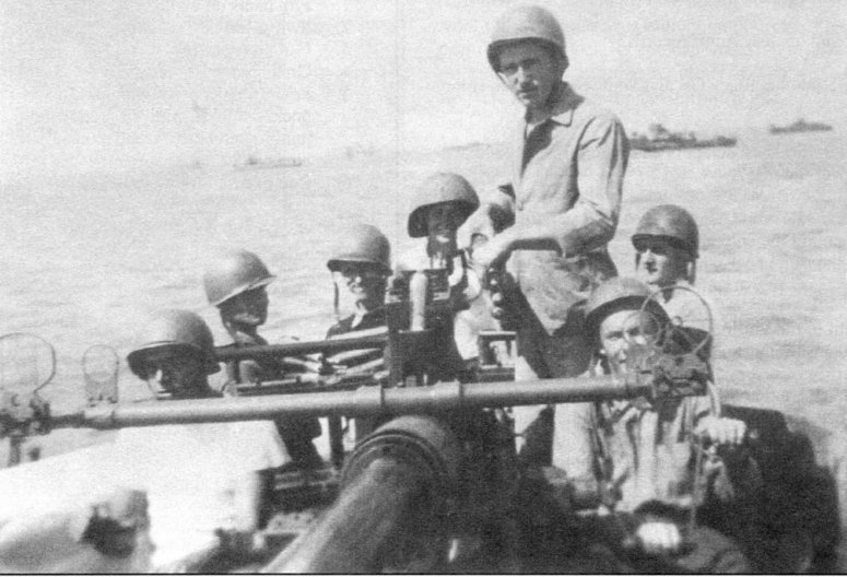 79k | USS LCI(G)-561's bow 40mm gun crew: Seated left; Trainer, Tom Massa; Seated right, Pointer, Connie Mulherin; Standing, 1st Loader, Andy Mihalik; Rear, left to right, George Keffer, George Ferris, Dick Cole, Jim Manning. Photo from USS Landing Craft Infantry National Association 2002 calendar, courtesy Connie Mulherin, USS LCI(G) 561 |