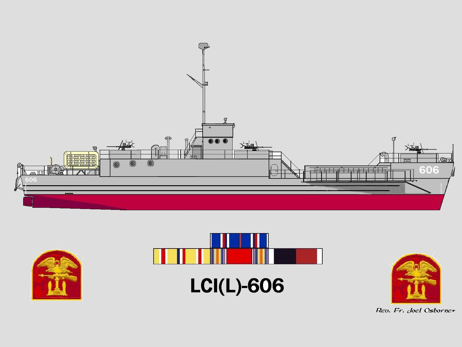 228k | USS LCI-606 tying up alongside an LCT, date and location unknown. Photo from US Navy Memorial |