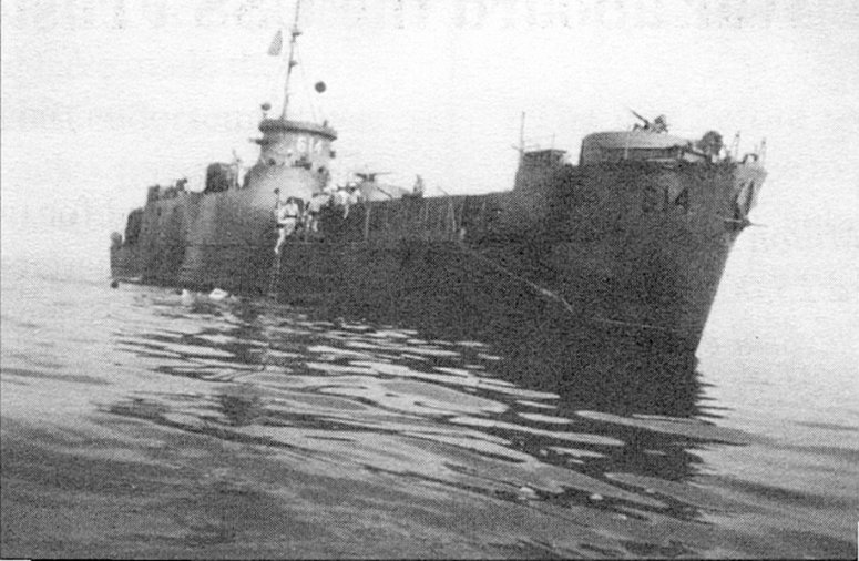 88k | USS LCI(L)-614 at anchor off Norfolk, VA. in June 1944. Note that the crew is enjoying a swim call. Photo from the USS LCI National Association's newsletter "The Elsie Item", Issue #48, April 2004, courtesy of John R. Zudell, son of Robert J. Zudell, RM2/c USS LCI 614. |