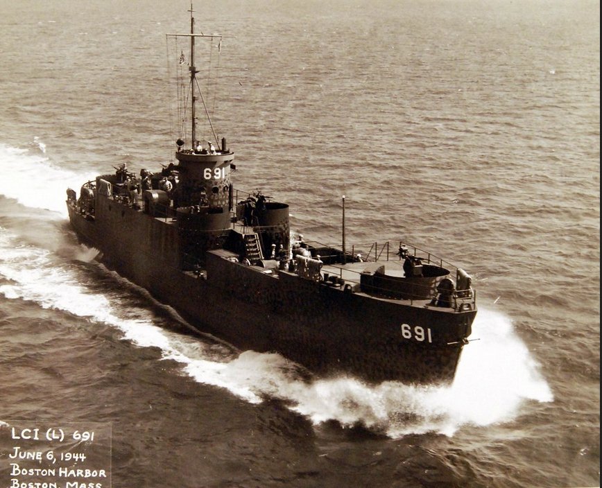 USS LCI(L)-691 underway in Boston Harbor, 6 June 1944, three days after commissioning.