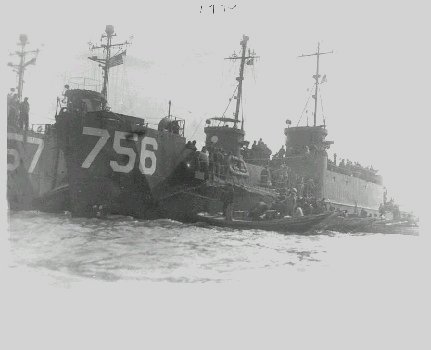 41k | USS LCI(G)-756 unloading Japanese prisoners into a whaleboat at Naha City,