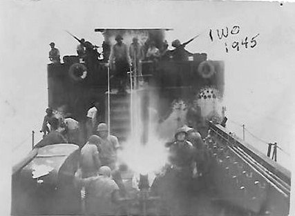 23k | USS LCI(G)-756 fires a 4.2-inch mortar shell during the bombardment of Iwo Jima in February 1945.