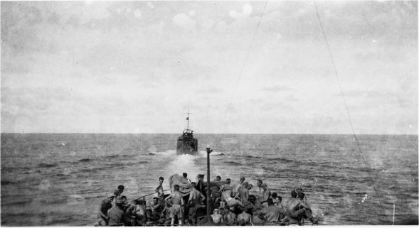 34k | USS LCI(L)-776 enroute to Zamboanga, with members of Co. E. 21st Regiment, 24th Division aboard, date unknown. Photo taken from USS LCI(L)-1033 by Robert N. Rosenthal. |