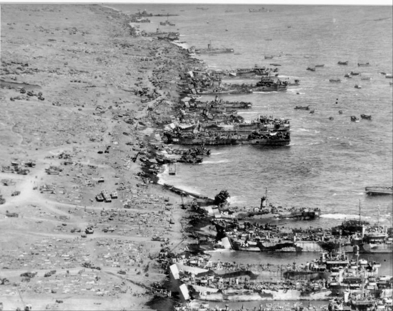 121k | Aerial view of the Iwo Jima beachhead, circa February 1945. Ships that can be can identified include