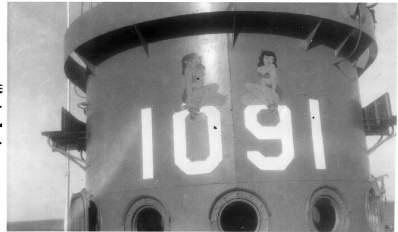 46k | USS LCI(L)-1091 conning tower with two painted ladies above the hull number. One of the ladies was painted by Louis Jiardina. | Charles Jiardina for his father Louis Jiardina USS LCI(L)-1091 | |