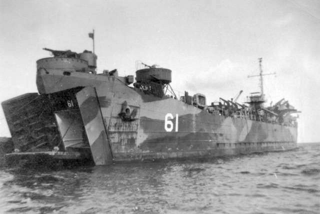 91k | USS LST-61 moored, date and location unknown. | Ann Ruyle Hoffstetter for her father LTjg. Dwight Ruyle USNR USS LST-61 | |