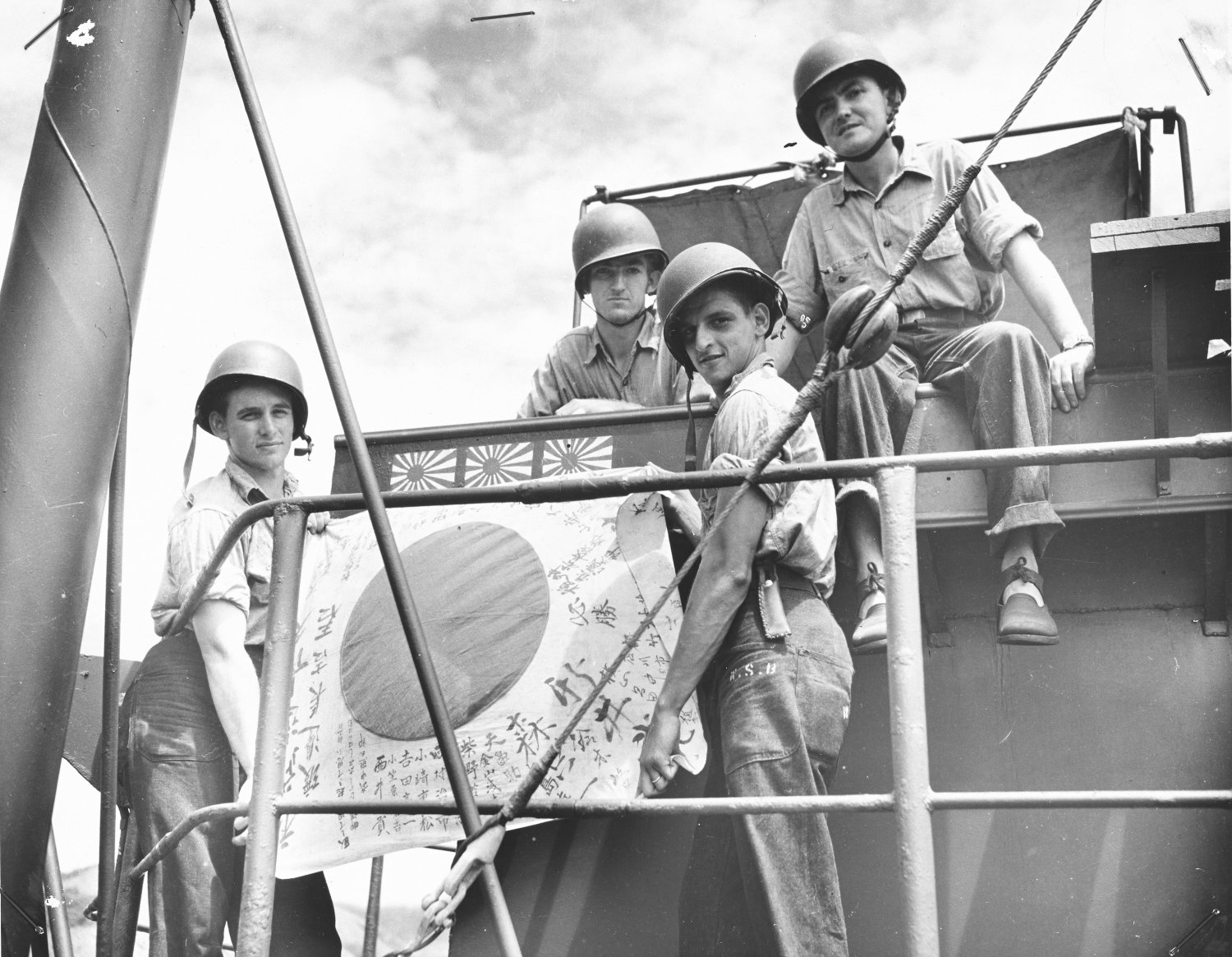 296k | During the Hollandia operation in April 1944 four USS LST-66 Coast Guardsmen display a Japanese battle flag - their souvenir