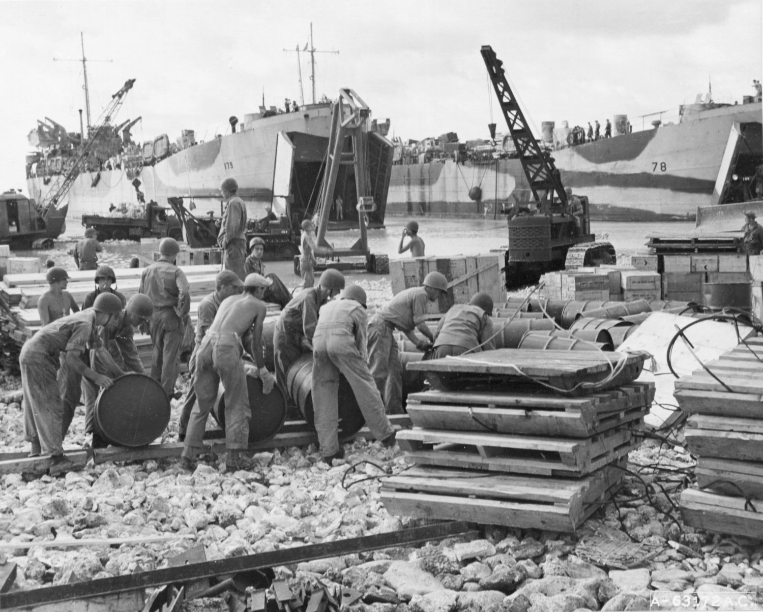 301k | US Army soldiers unloading gasoline drums from USS LST-179 and USS LST-78 during landing operations on
