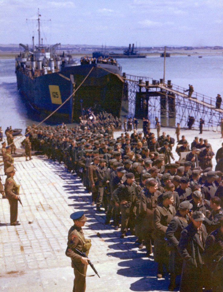 HM LST-165 unloading German Prisoner of War at Gosport, England. Between 12 June 1944 and 31 August 1944 LST-165 transported 1,986 German Prisoners of War from Normandy to Gosport. Photo from CFJIC (Canadian Forces Joint Imagery Centre). |