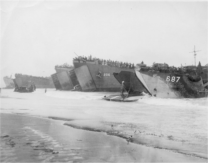 1327k | LSTs, including USS LST-206 and USS LST-245 beached at Cape Sudest, New Guinea, 12 March 1944, while loading vehicles destined for Los Negros, Admiralty Islands Group. US National Archives photo # III-SC 271519, Box 504, a US Army Signal Corps photo, by T/4 Henry C. Manger, now in the collections of the US National Archives. |