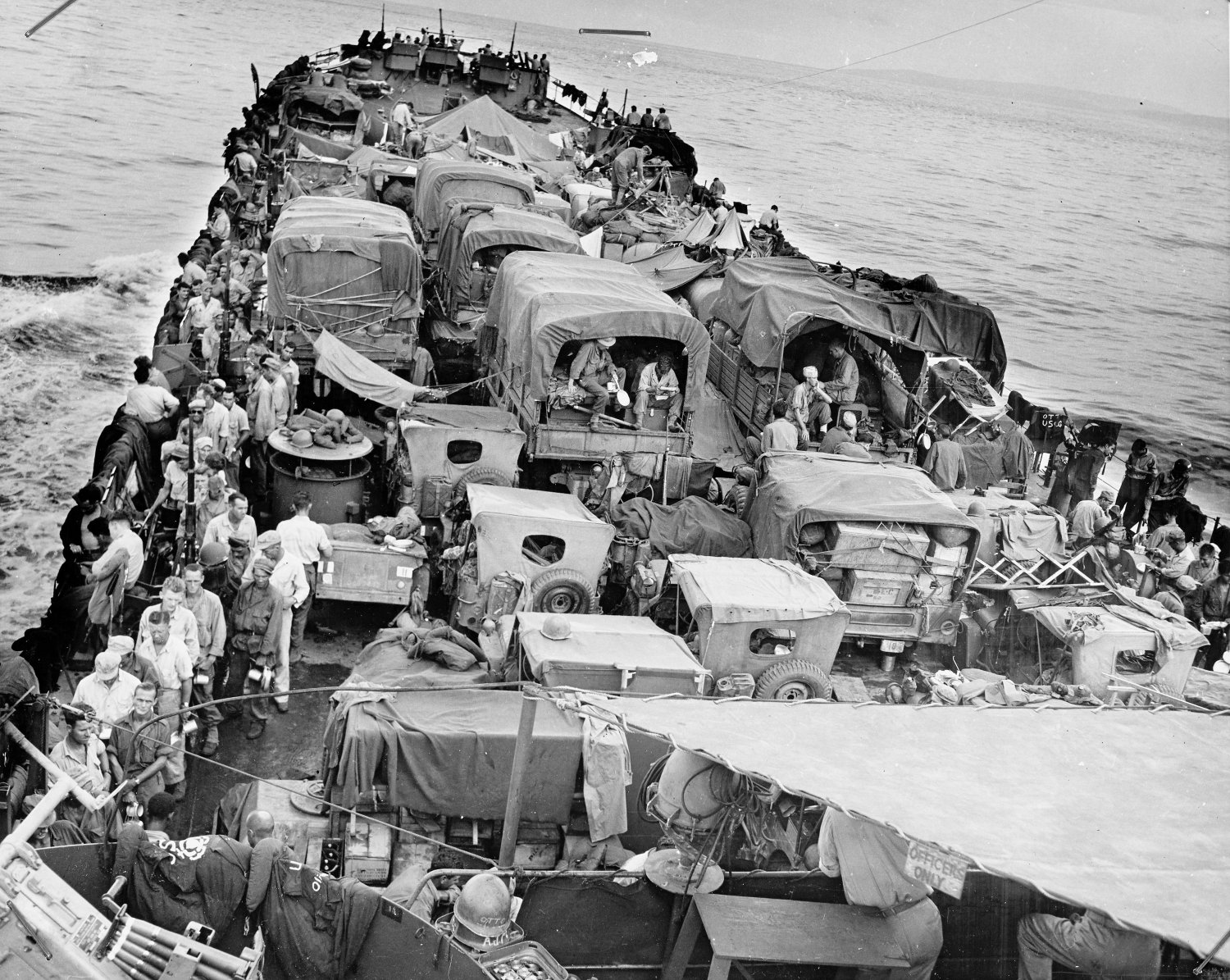the stuff of war to General MacArthur's forces now occupying Leyte Island. At the left, a chow line of soldiers moves slowly over the deck crammed with trucks, jeeps and