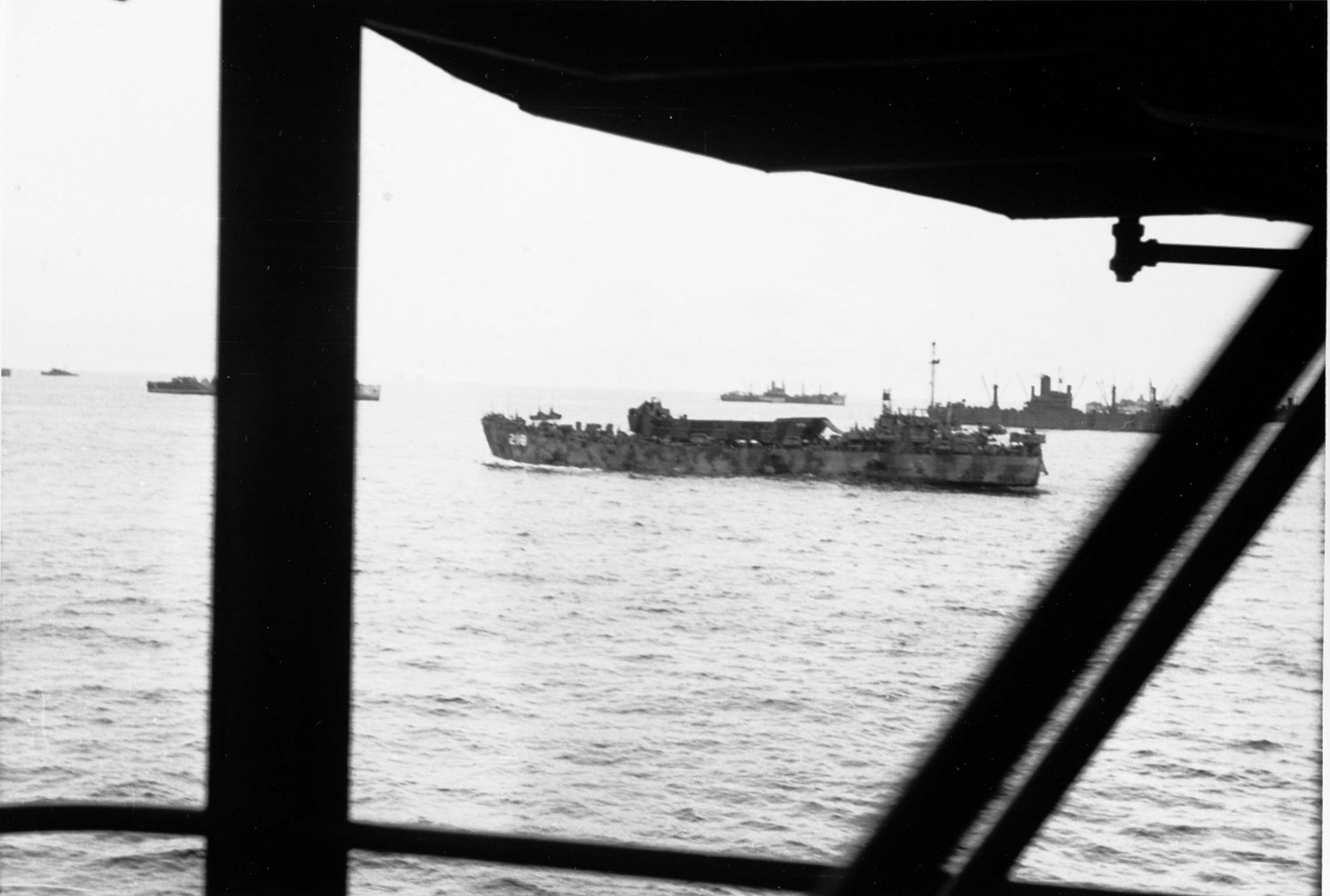 157k | USS LST-218 underway with LCT(5)-258 loaded on her main deck during