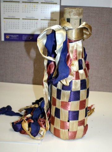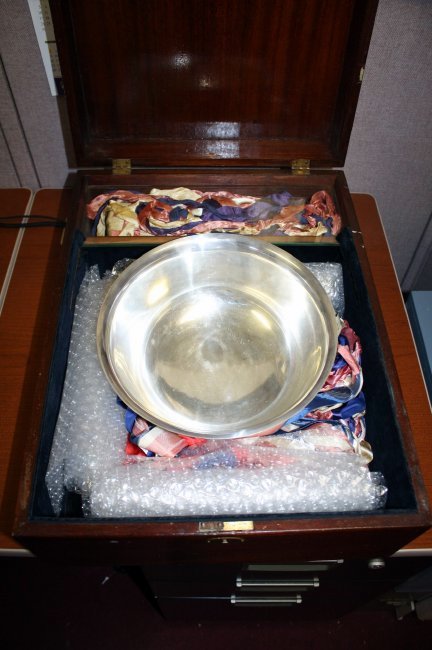 1016024203 | 45k | Christening bottle, ribbons and wooden box for storing the christening bottle, silver ceremonial bowl, and ribbons used in the christening and launching of