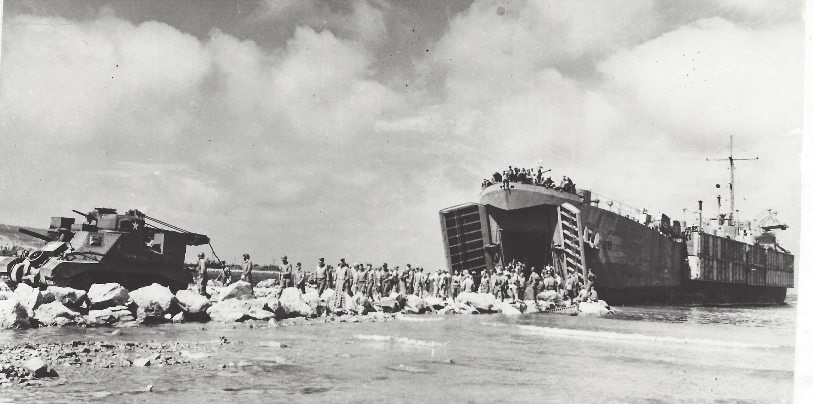 428k | USS LST-286 unloading in North Africa in 1944. Note pontoon causeways attached to port side. US Navy photo from Acme. |