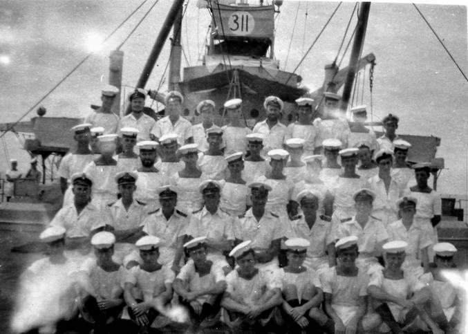 130k | HM LST-311 officers photo Back Row S/Lt Ganny, S/Lt Fasey (myself), S/Lt Spiro (pontoon party), S/Lt Denby, Front Row Lt Bremner, Lt/Cdr Wylie (captain), Lt ----(chief engineer) all RNVR except the chief who was RNR, at Singapore, circa December 1945 to March 1946. | Tony Fasey HM LST-311 (ex Sub/Lt RNVR gunnery officer) | |