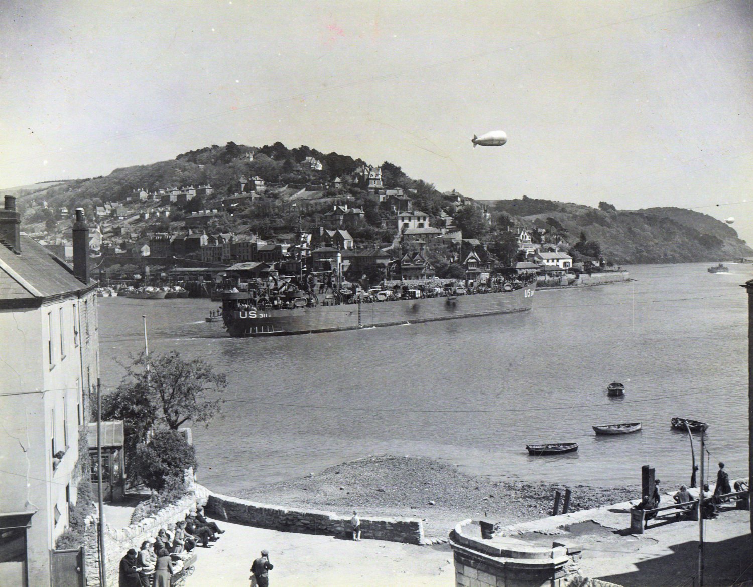145k | Invasion shipping in Dart River, at Dartmouth, England, awaiting the invasion signal, 2 June 1944. Barrage balloons are overhead.