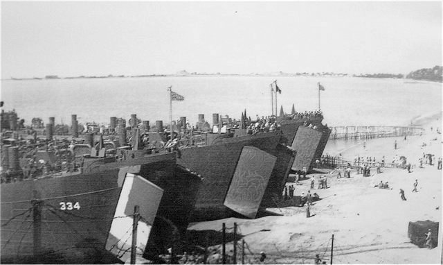78k | USS LST-334 and three additional LSTs beached while loading troops, supplies and vehicles at Kissing Point, Port Townsville, Australia, date unknown. | Peter Dunn and Joe Radigan MACM USN Ret. | |