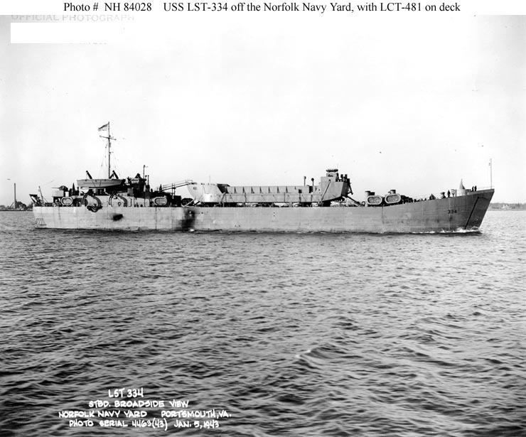 89k | Starboard broadside view of USS LST-334 off Norfolk Navy Yard, Portsmouth, VA., with LCT-481 on deck, 5 January 1943. Photograph was received from the Norfolk Naval Shipyard, Portsmouth, VA., in 1972. US Naval History and Heritage Command Photo # NH 84028. |