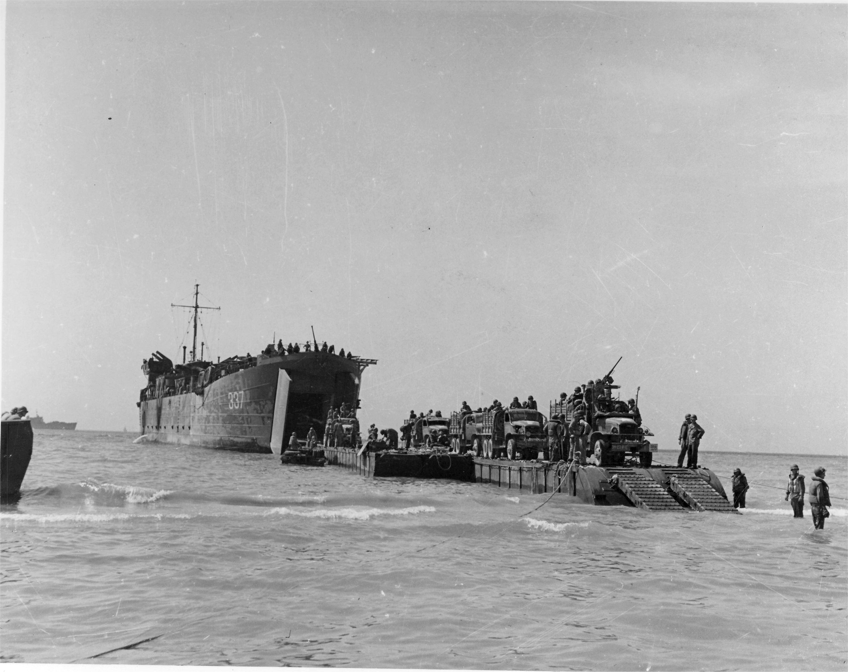 1169k | USS LST-337 off-loading troops and equipment of the US Army's 151st Field Artillery, 34th Infantry Division, over a causeway at