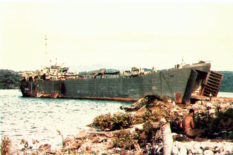 89k | USS LST-341 beached at Segi Point, New Georgia, December 1943 US Navy photo. |