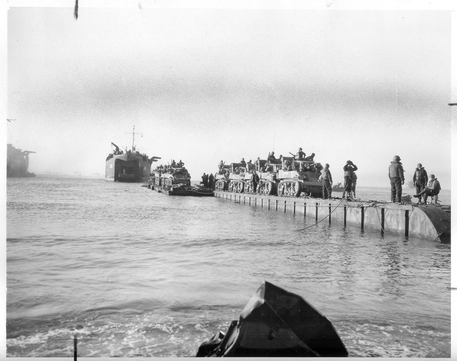 288k | USS LST-349 unloading tanks across a pontoon causeway at Anzio, date unknown. | Raymond Cvetovich, Ph.D. | |