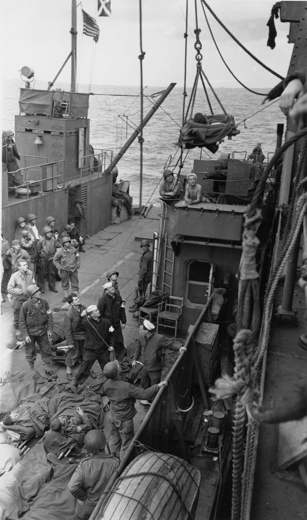 186k | Casualties being brought aboard USS LST-357 from an LCT on D-Day, 6 June 1944. Few casualties could be retrieved from Omaha Beach on the 1st day. They were brought out in relatively small craft and then hoisted aboard the LST by sling. LST-357 received only about a dozen before turning back to England that evening for the second load of Army personnel and their equipment. US Navy Medicine photo # 09-7912-49 by Dale Groom, LTJG, MC, USNR. |
