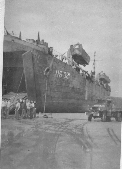 129k | USS LST-381 unloading equipment at Normandy, June 1944. | Rick Thorn for his father Charles Henry Thorn USS LST-381 | |