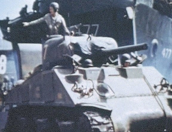 101k | USS LST-477 unloading an M4 Tank of the USMC 3rd Tank Battalion the morning of 23 February 1945 at Iwo Jima about 45 min after the flag raising. LST-477 was delayed because of a Kamikaze hit the morning of 19 February 1945 the ship was heavily damaged but the crew and Marines worked together and managed to limp in and get back in the war. | John Somes for his father George E. Somes USS LST-477 | |