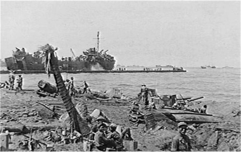 71k | USS LST-530 beached at Lingka, Tarakan Island, Borneo, May 1945, while discharging stores onto a pontoon pier. The shell holes and shattered palms are evidence of the Allied bombardment. Australian War Memorial photo # 305124. |