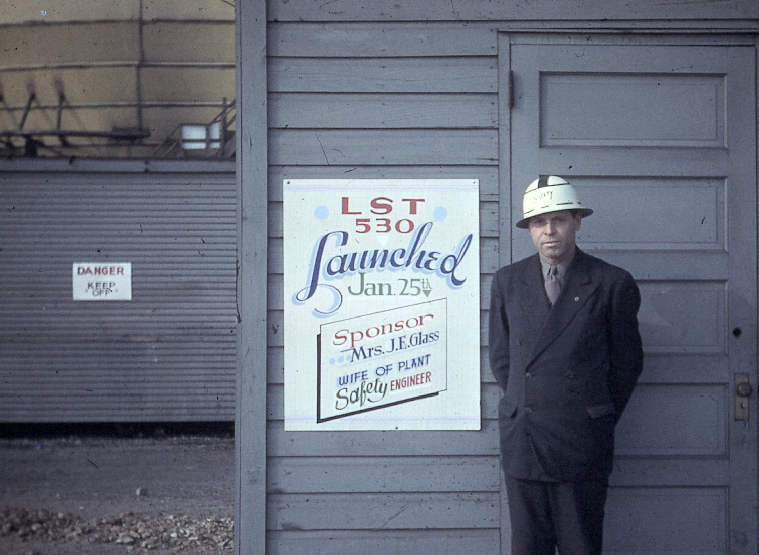 260k | Sign posted in the Jeffersonville Boat and Machine Co. shipyard announcing the scheduled launching of LST-530 on 25 January 1944. Shipyard Safety employee's name is unknown. | Bill Glass | |