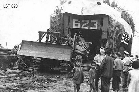 57k | USS LST-623 beached while unloading in Philippines, date and location unknown. | LST Home Port web site | |