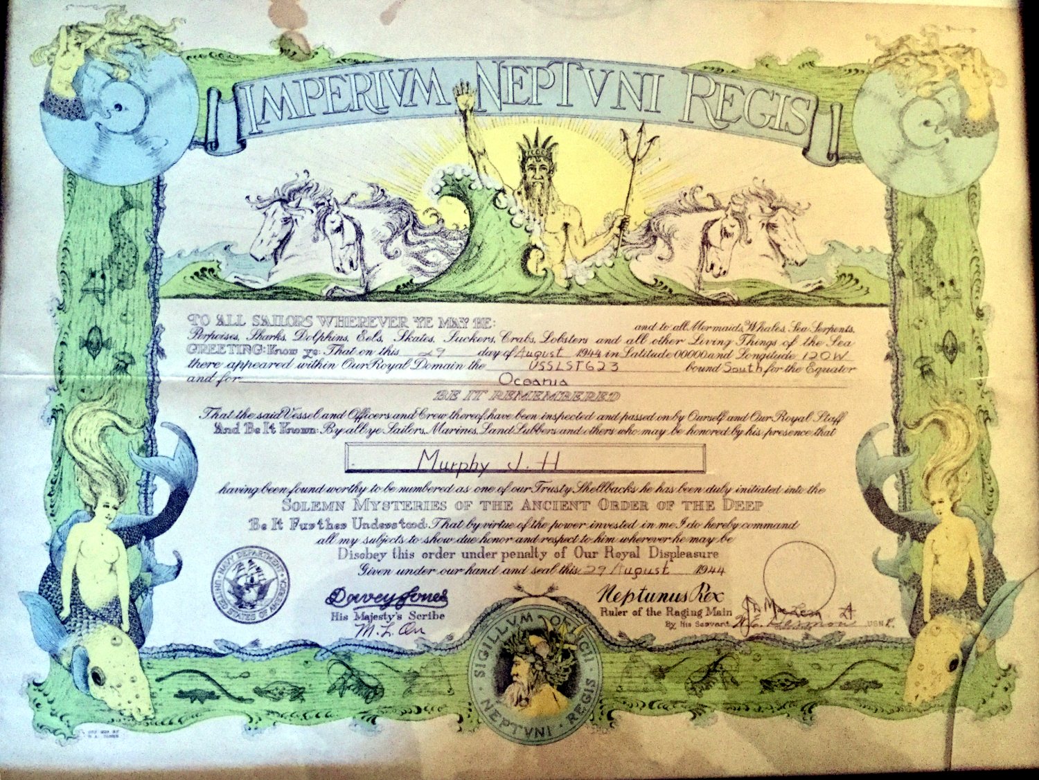 485k | Certificate issued aboard USS LST-623 to James H. Murphy having crossed the line on 29 August 1944. | Kathleen Golden for her father James H. Murphy USS LST-623 | |