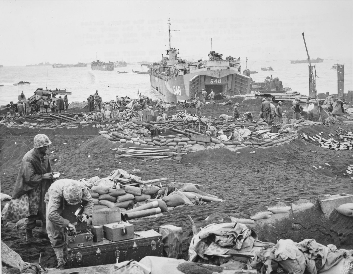 301k | USS LST-648 beached at Iwo Jima during the Assault and occupation campaign in February - March 1945. In the foreground