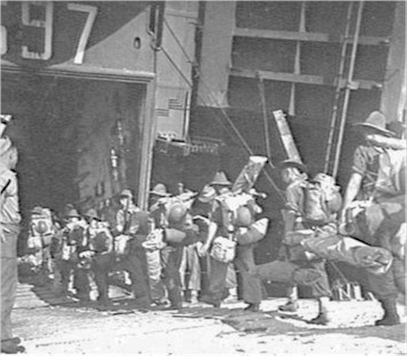 81k | USS LST-697 beached at Morotai, 1 June 1945, while members of B Troop 6th Battery, 2/3rd Anti Aircraft Regiment embark in preparation for "Operation Oboe 6". Australian War Memorial photo # 108695. |