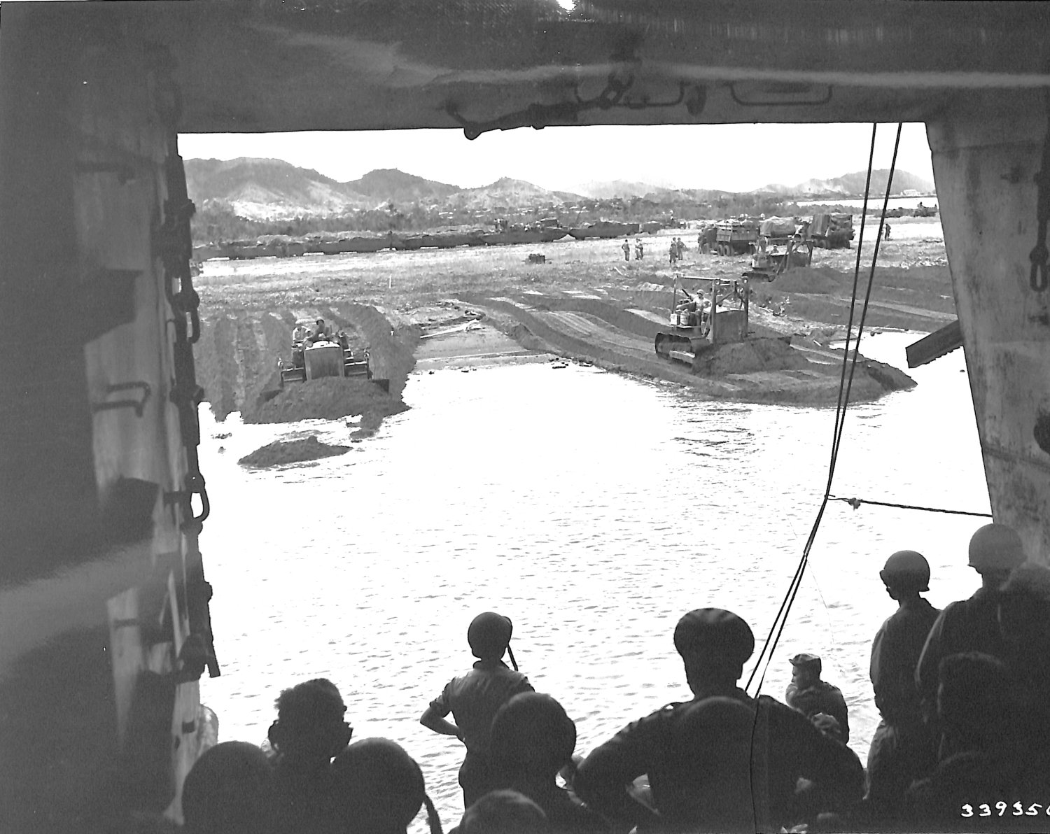 269k | Troops wait in the tank deck of USS LST-697 while a cat pushes a ramp out to the ship at Getaison Point, (White Beach) Leyte, Philippine Islands,