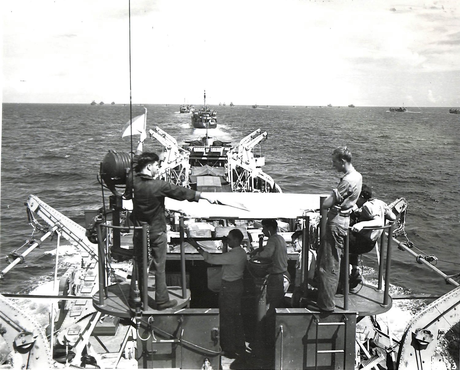 336k | View of the bridge of USS LST-697 enroute to Leyte, Philippine Islands, 18 October 1944. Note signalman signaling to another