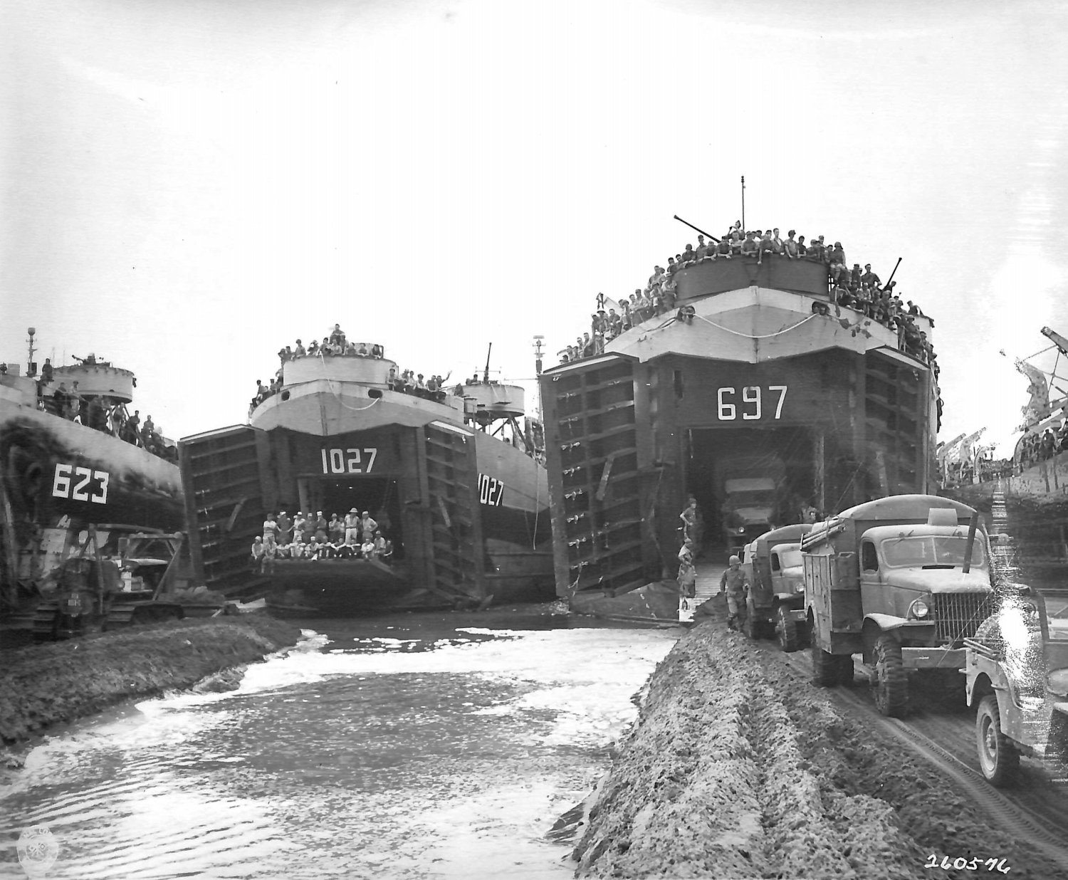 297k | USS LST-623, USS LST 1027 and USS LST-697 unload across