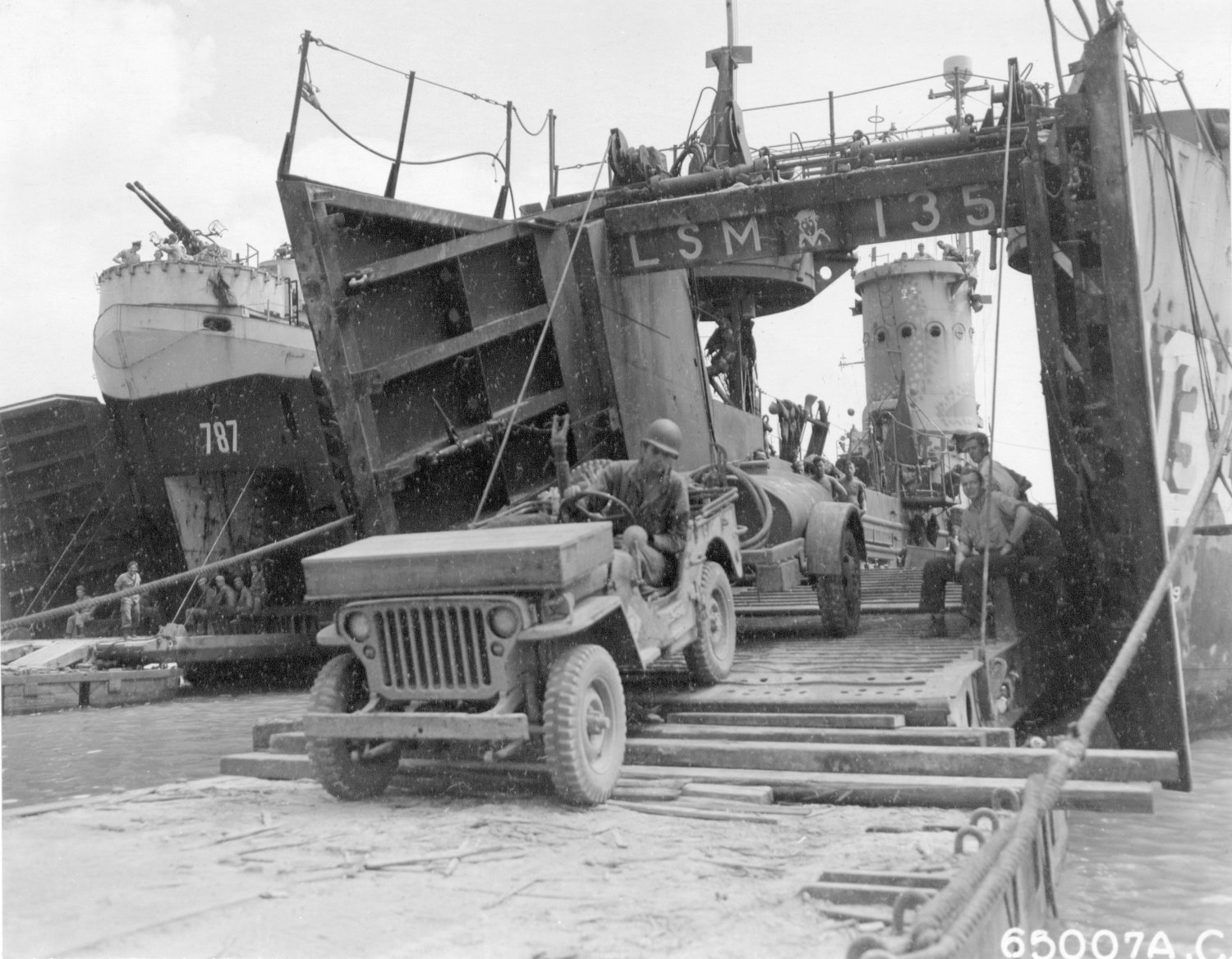 293k | USS LSM-135, and USS LST-787 unloading equipment of the 318th Fighter Group at Ie Shima, Ryukyu Islands, 29 April 1945. Driving Jeep Is Cpl. Giles N. Ragsdale, Malden, Missouri, 19th Fighter Squadron, 318Th Fighter Group. | David Upton | |