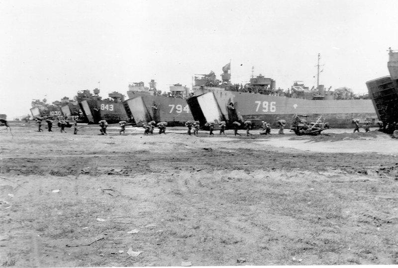 85k | From front to back, USS LST-796, USS LST-794, USS LST-843, unidentified LST, and USS LST-1030 beached, date and location unknown while disembarking troops. | ||