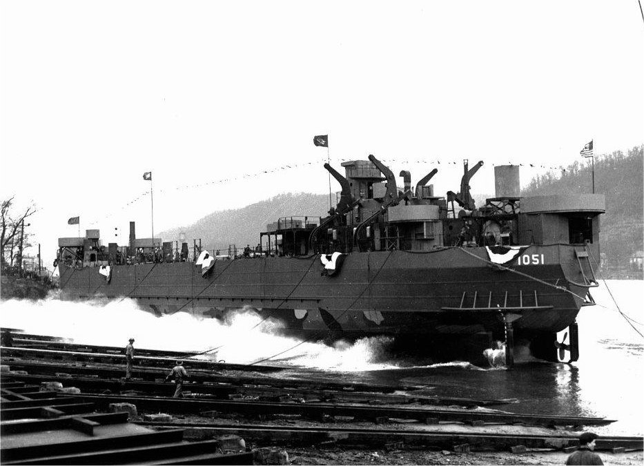 111k | USS LST-1051 launching at Dravo Corp., Pittsburgh, PA., circa 3 March 1945. | LTjg. William D. Stieg USNR-RT (last CO of USS LST-1051) | |