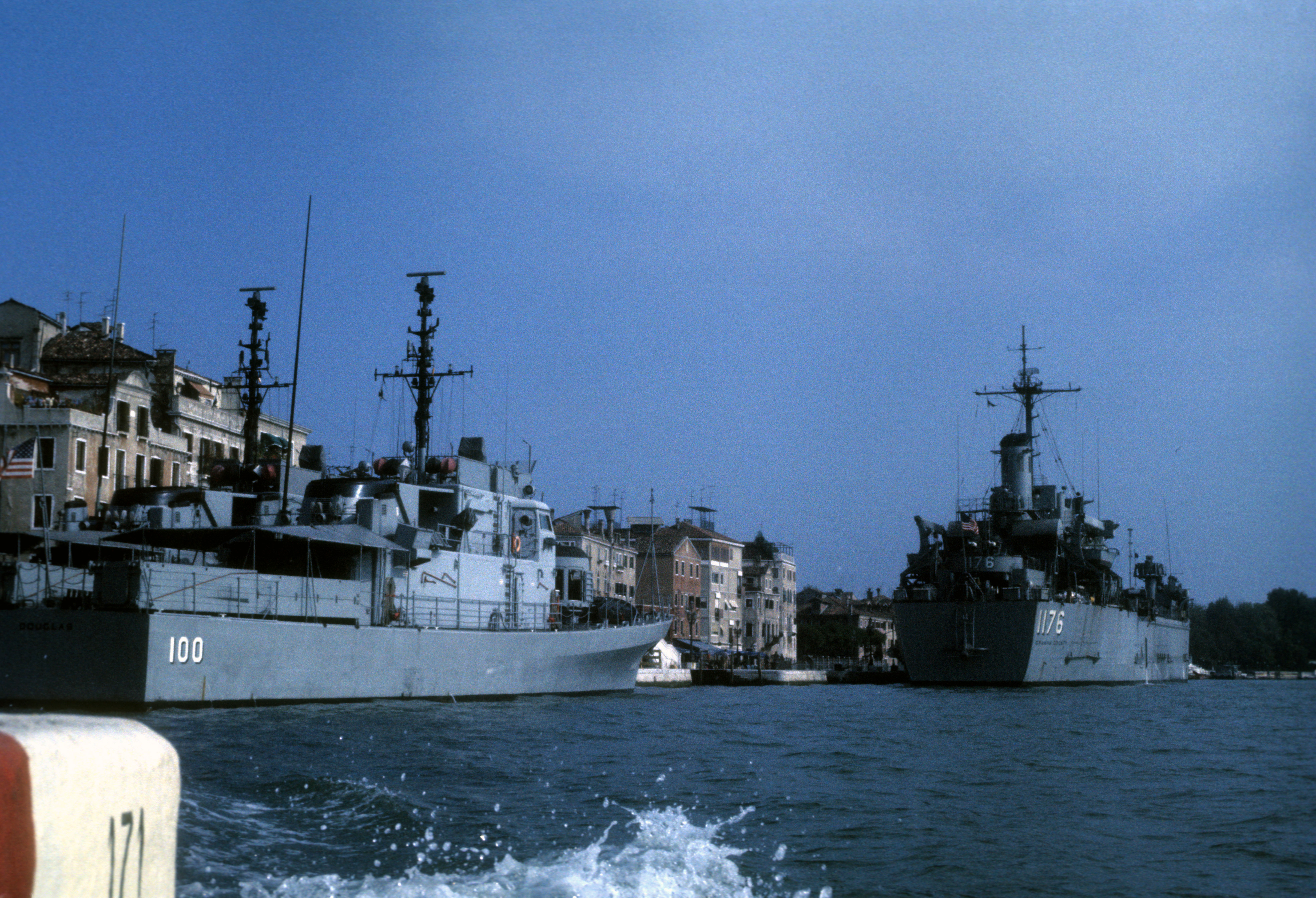 3841k | USS Graham County (AGP-1176) moored at Venice, Italy in October 1973. Moored astern of Graham County is USS Douglas (PG-100). | William Hooper | |