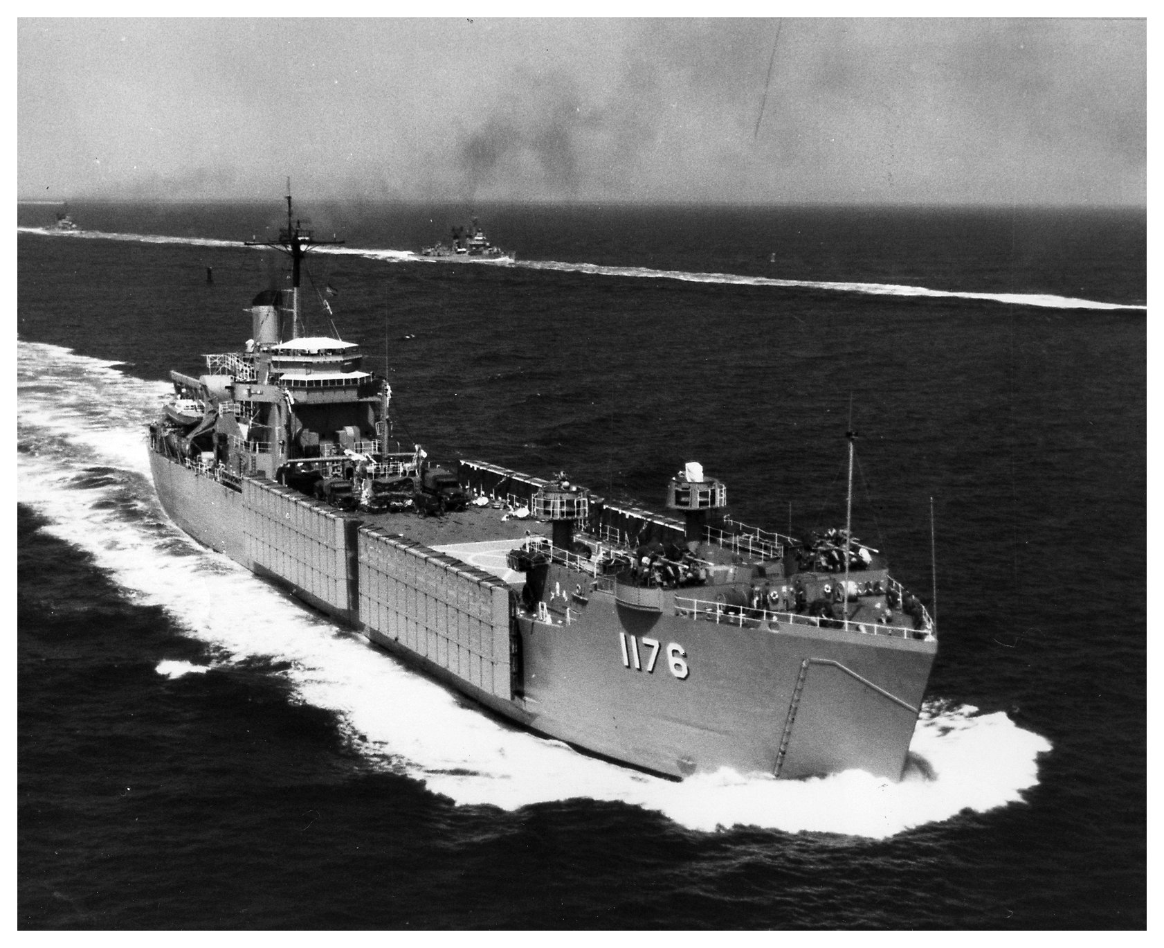 88k | USS Graham County (LST-1176) beached at Vieques, Puerto Rico, in 1964. Note her bow door configuration, 3"/50 twin gun mounts, and radar-equipped gun directors. | US Naval Historical Center | |