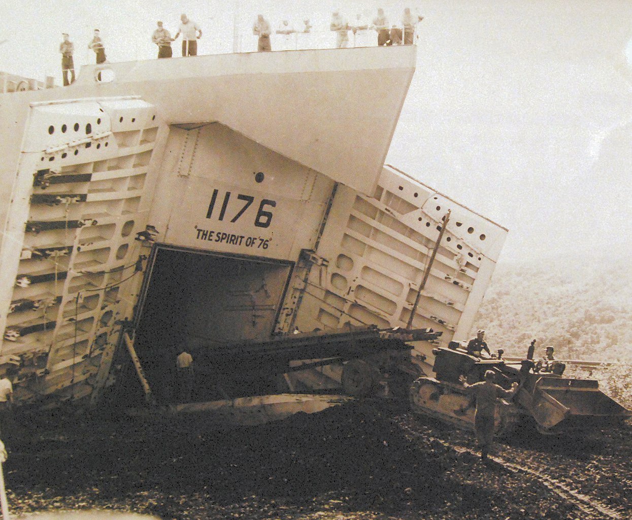 297k | USS Graham County (LST-1176) beached while off-loading supplies that helped U.S. Navy Seabees built a bridge that spanned the flooded Lake Miraogoane,