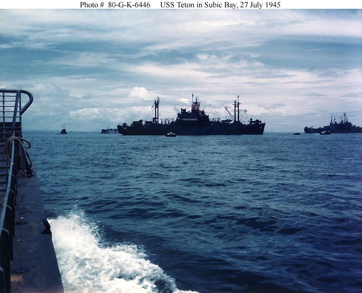 88k | USS Catskill (LSV-1) is partially visible to the far right of this photo of USS Teton AGC-14) in Subic Bay, Philippine Islands, 27 July 1945. Taken from on board an LCM landing craft by PH1 R. Schuddekopf, assigned to Commander, Amphibious Group Twelve. US National Archives photo # 80-G-K-6446 (Color), a US Navy photo now in the collections of the US National Archives. |