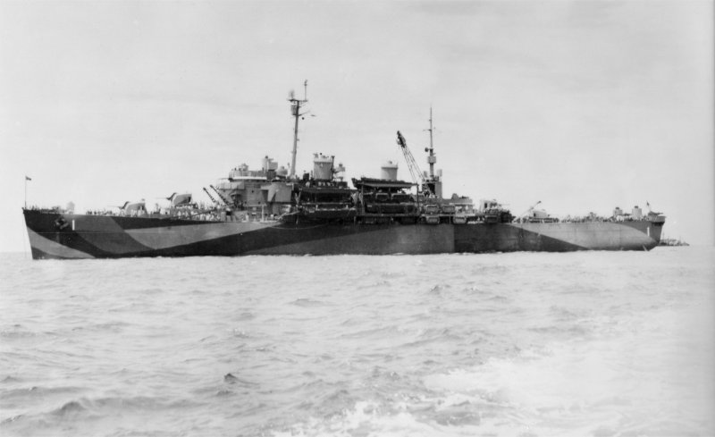 41k | USS Catskill (LSV-1) under way in San Diego Bay during a shakedown cruise in August 1944. Her camouflage is Measure 31 Design 15L. | Eldon Brodie, GM1 USS Catskill June 1944 - August 1946 | |