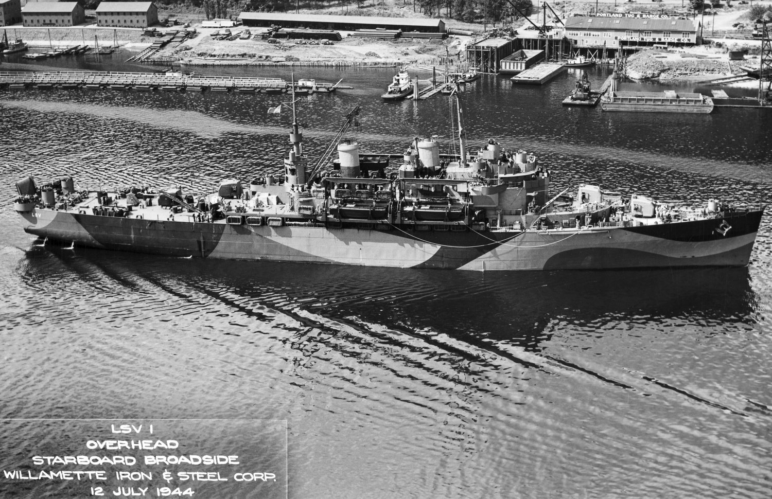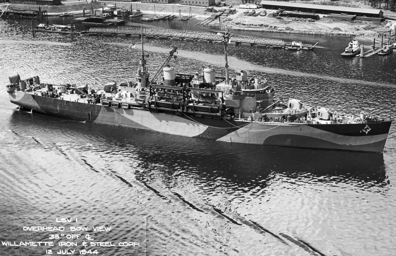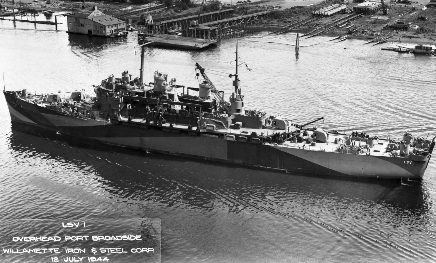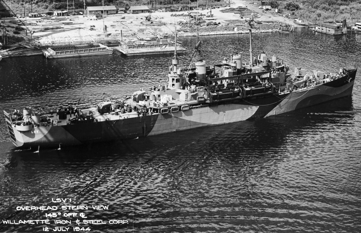 103k | USS Catskill (LSV-1) under way near her builders yard, Willamette Iron & Steel, Corp., Portland, OR., 12 July 1944.