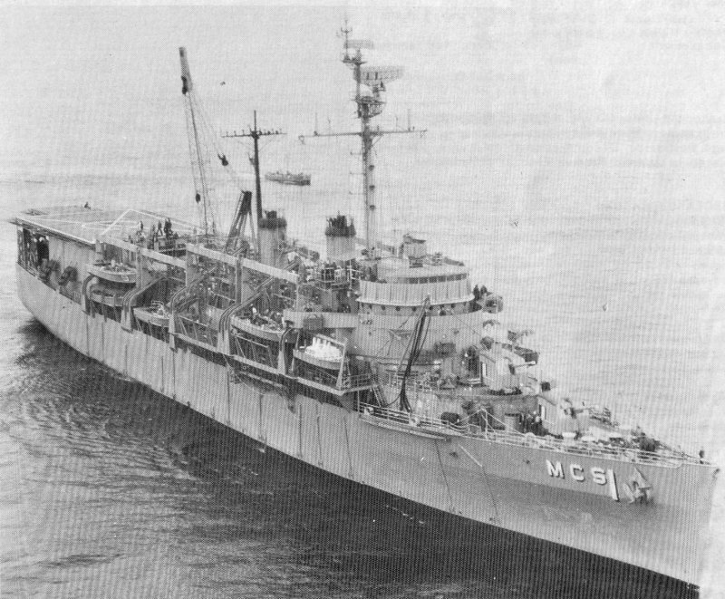 135k | USS Catskill (MCS-1) under way 1968 location unknown. Note davits for holding Minesweeping Launches (MSL)and ships' boats.