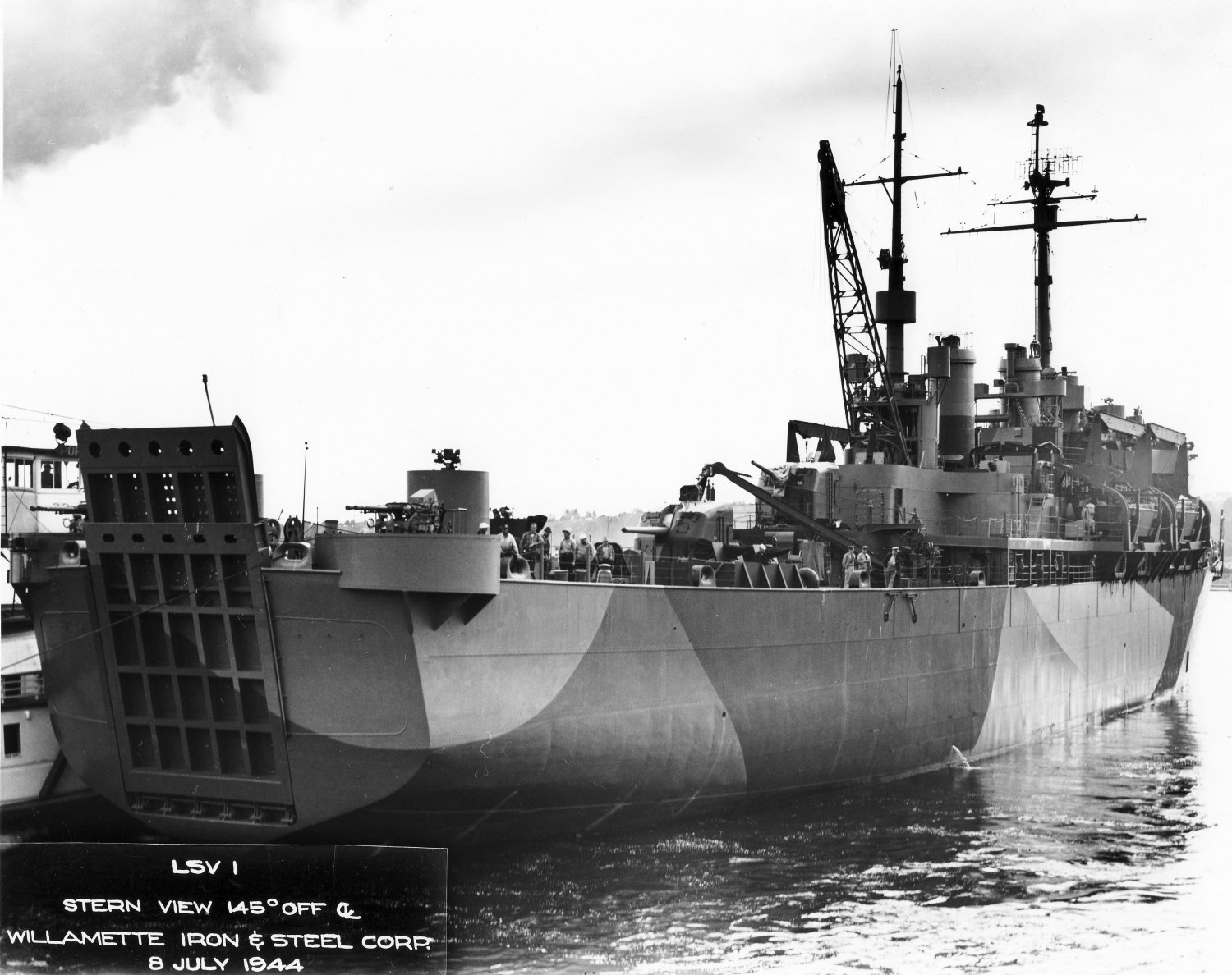 237k | Stern view of USS Catskill (LSV-1) underway near her builders yard, Willamette Iron & Steel, Corp., Portland, OR., 8 July 1944.