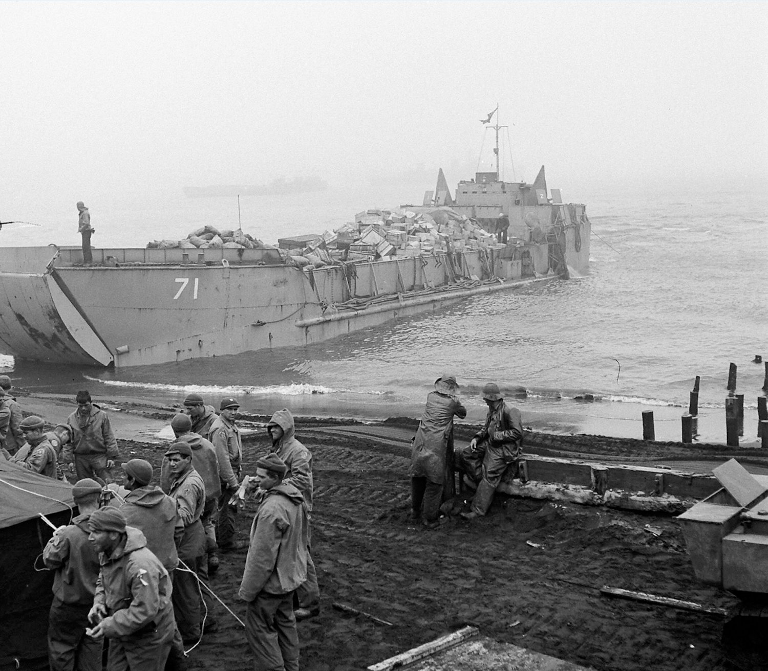 329k | LCT(5)-71 and LCT(5)-320 unloading across the beach at Kiska Island in the Aleutians, summer 1943. | Robert Hurst | |