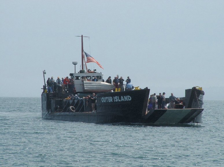 70k | Ex-LCT(5)-203 in merchant service as Outer Island at Bayfield, WI. World War II LCT veterans attending the 20th LCT reunion in June 2003 take their first ride on an LCT in almost 60 years. | LCT Flotillas of World War II ETO PTO web site | |